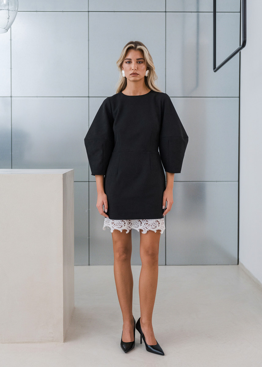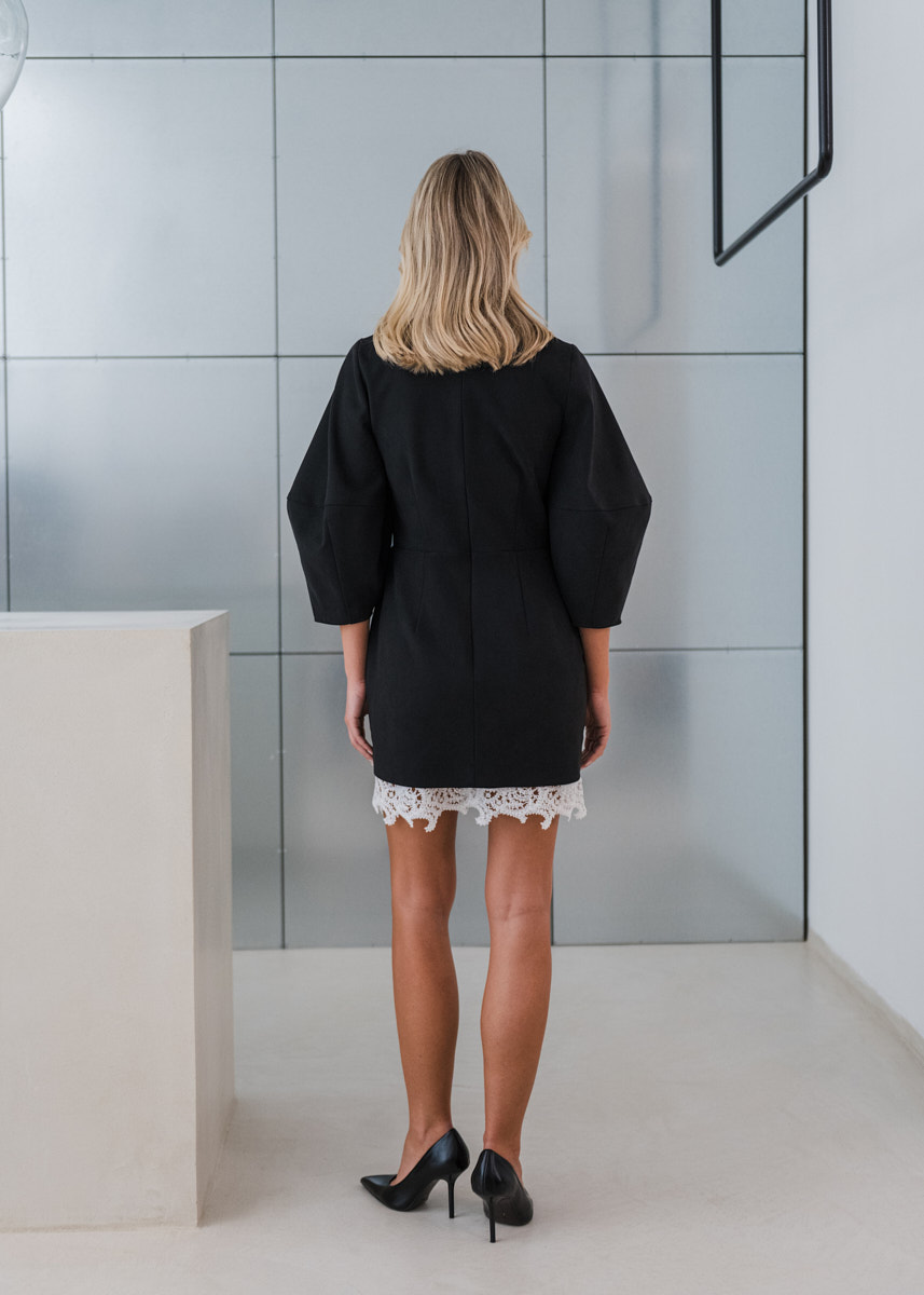 Merrin haljina izrađena je od tkanine s efektom brušene kože koja obliku daje mekoću i stabilnost. Minimalističkog kroja s naglašenim rukavima i donjim rubom od vunene čipke, donosi spoj arhitektonskog i ženstvenog. Suptilna, a upečatljiva — haljina koja nosi karakter bez pretjerivanja.