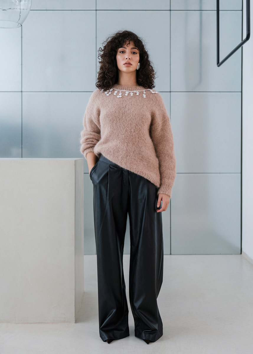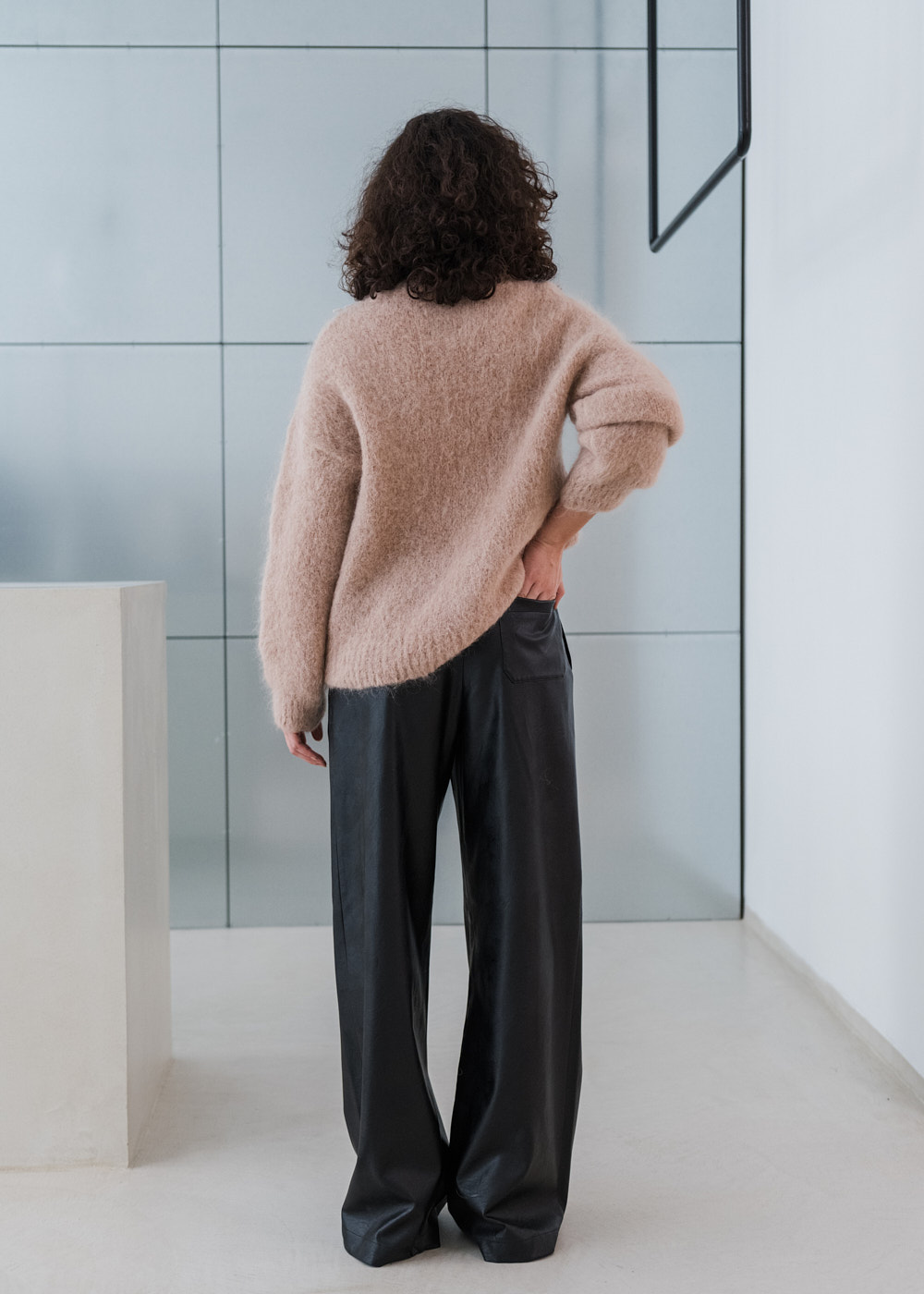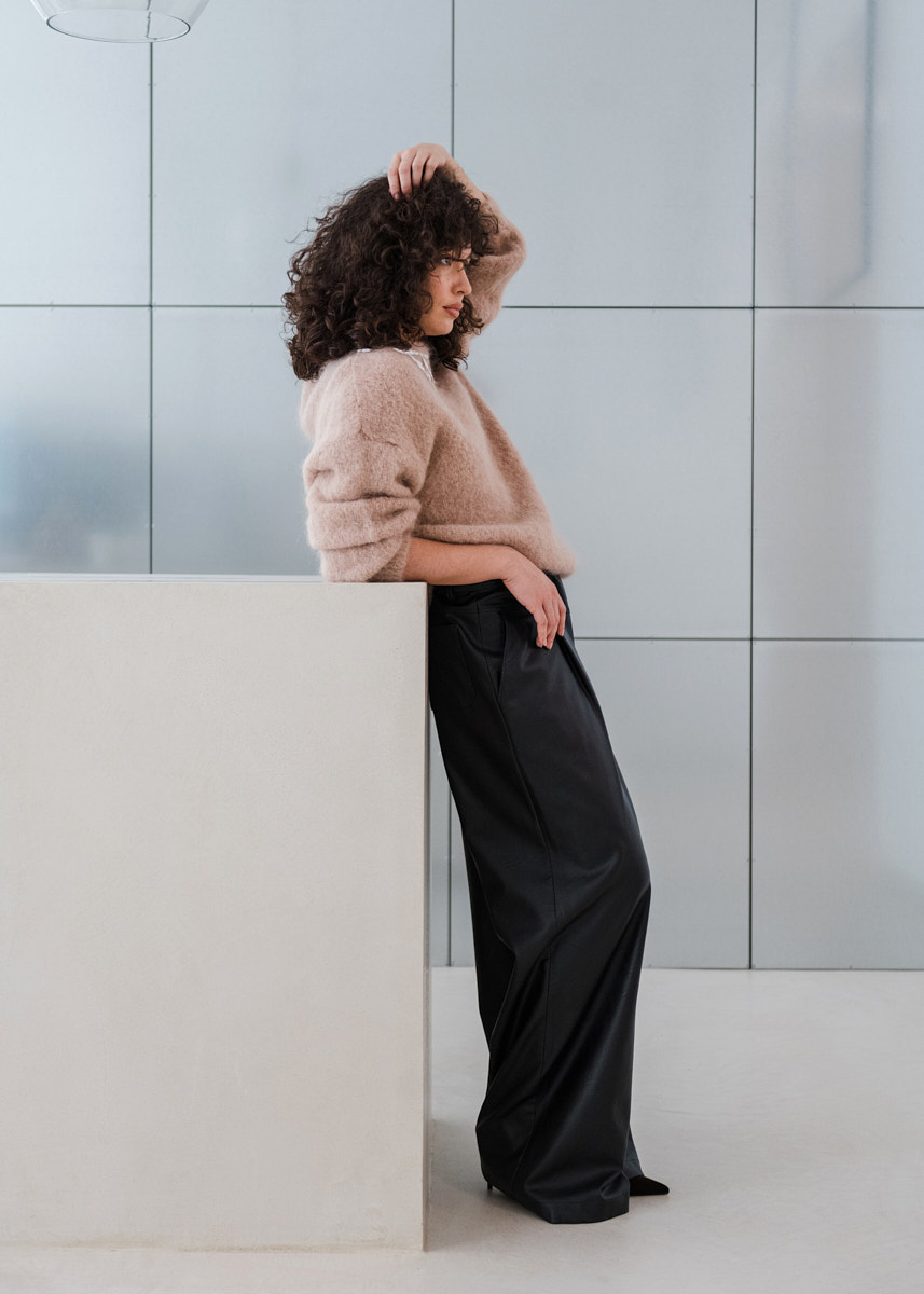 Mekani i raskošni PULOVER MIOMIO izrađen je od luksuzne mješavine mohera i alpake, koja pruža savršenu toplinu i laganu, paperjastu teksturu. Suptilna blijedo roza nijansa i jednostavan, profinjen kroj čine ga bezvremenskim komadom koji se lako uklapa u svaku garderobu. Udoban, elegantan i savršen za hladnije dane — nosiv uz kožne hlače, suknje ili traperice.