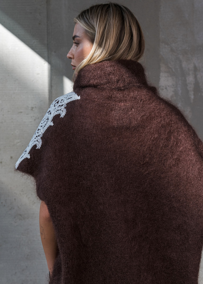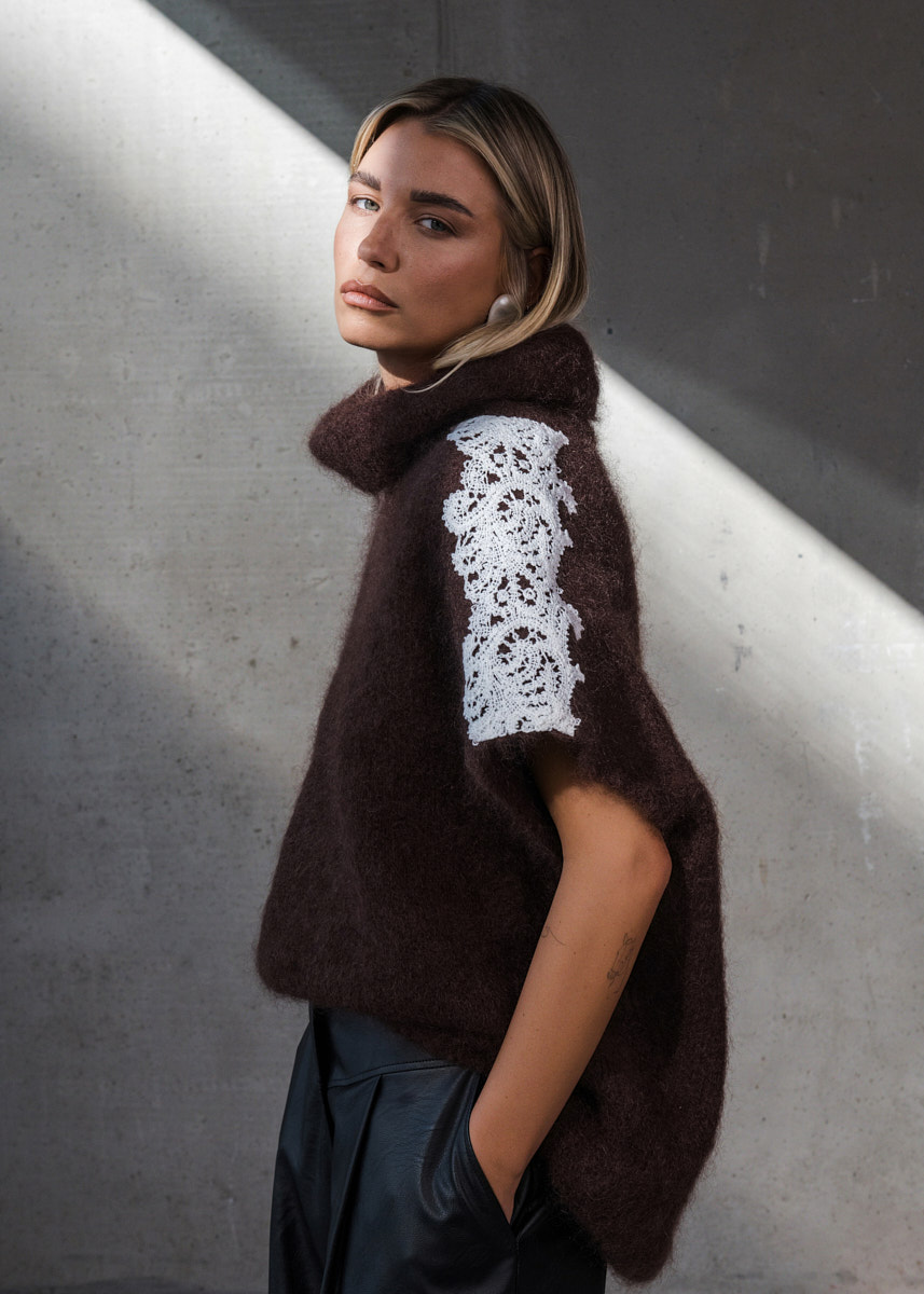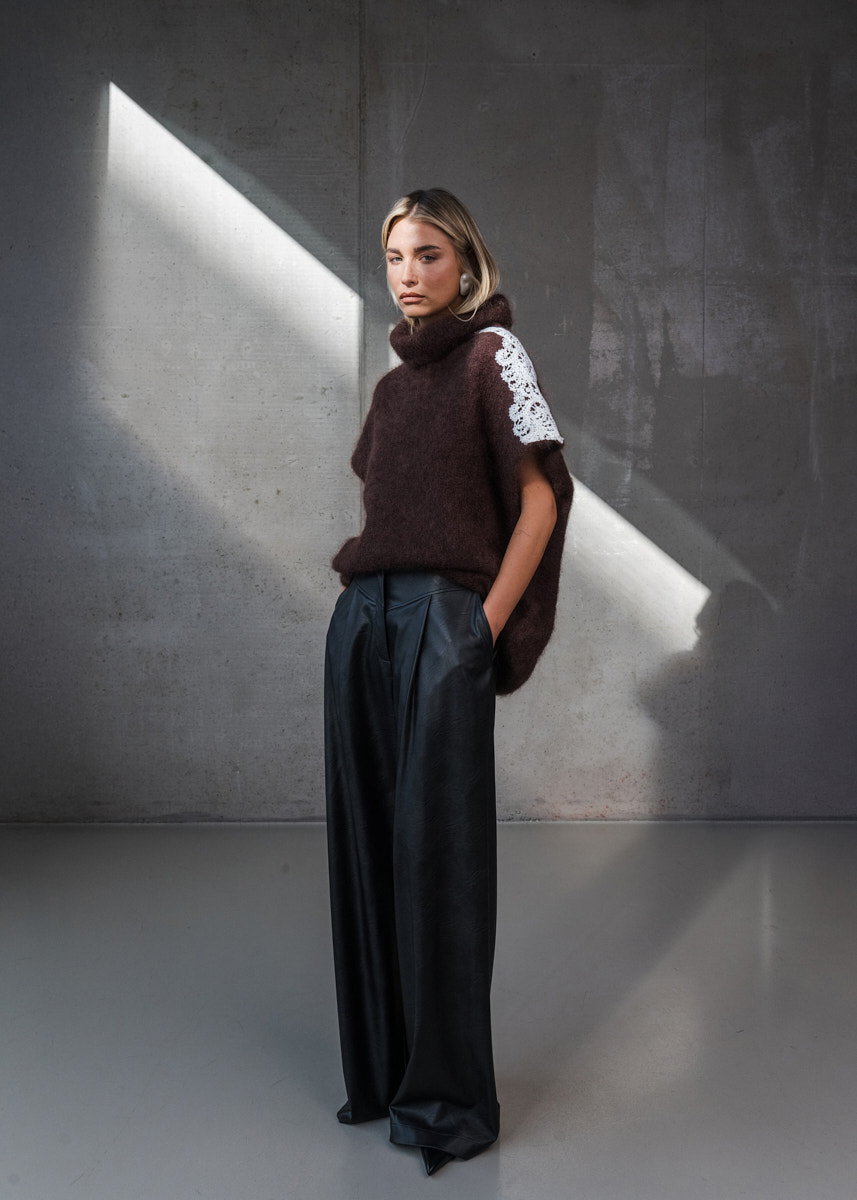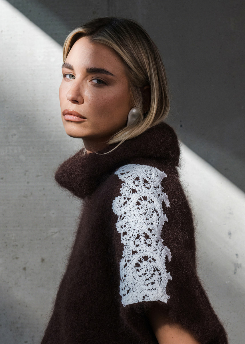 Nyra pulover izrađen je od raskošne mješavine kid mohéra s dodatkom elastičnih vlakana za mekoću i lakoću pokreta. Krasi ga volumen s profinjenim padom i detalj vunene čipke na ramenu koji unosi kontrast tekstura. Topao, prozračan i vizualno snažan komad koji definira suvremenu eleganciju.
